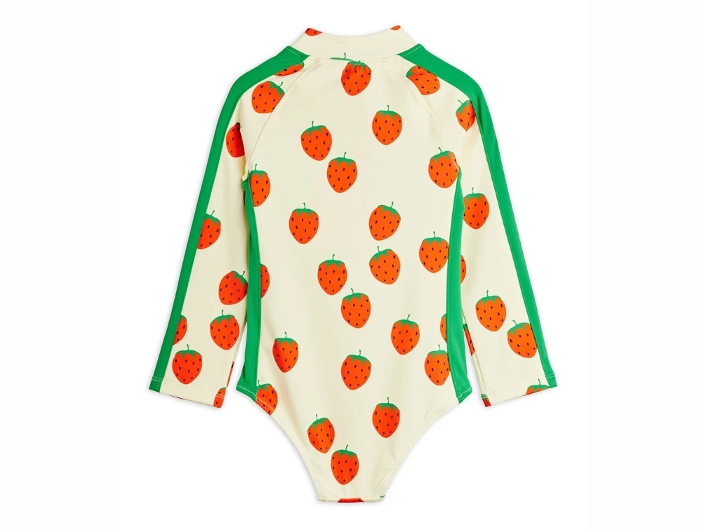Langærmet badedragt i råhvid nuance fra Mini Rodini med all-over jordbærprint og kontrastfarvede ærmer.