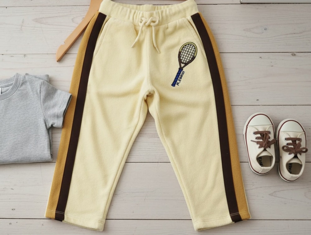 Gule bløde bukser med cool tennisemblem fra Mini Rodini.