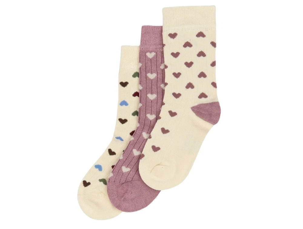 Bambus strømper i 3-pak fra MiniPop med hjerteprint i rosa og beige nuancer. Ét par er ribstrikket. Strømperne er bløde, OEKO-TEX® certificerede og har sømløs tåsøm, som gør dem ekstra behagelige at have på.