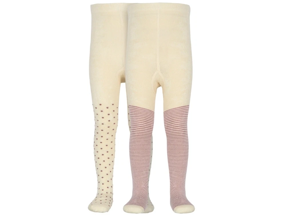 Bambusstrømpebukser i råhvid nuance fra MINIPOP med mønster i lyserød nuance. Sættet indeholder to par strømpebukser – ét par med små prikker og ét par med fine striber.