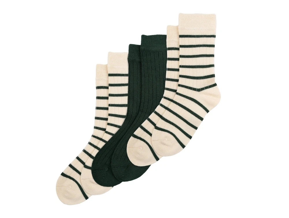 Bløde bambus strømper i 3-pak fra MiniPop i farven emerald green. Pakken indeholder to par med striber og ét ensfarvet par i rib. Strømperne er uden generende tåsøm og fremstillet i en bambusblanding, der føles ekstra blød mod huden.