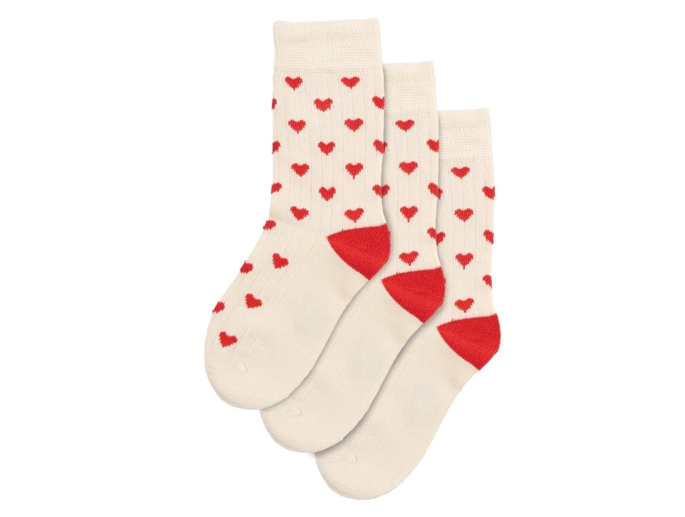 MiniPop bambus strømper 3-pak i off white med røde hjerter og sømløs tåsøm