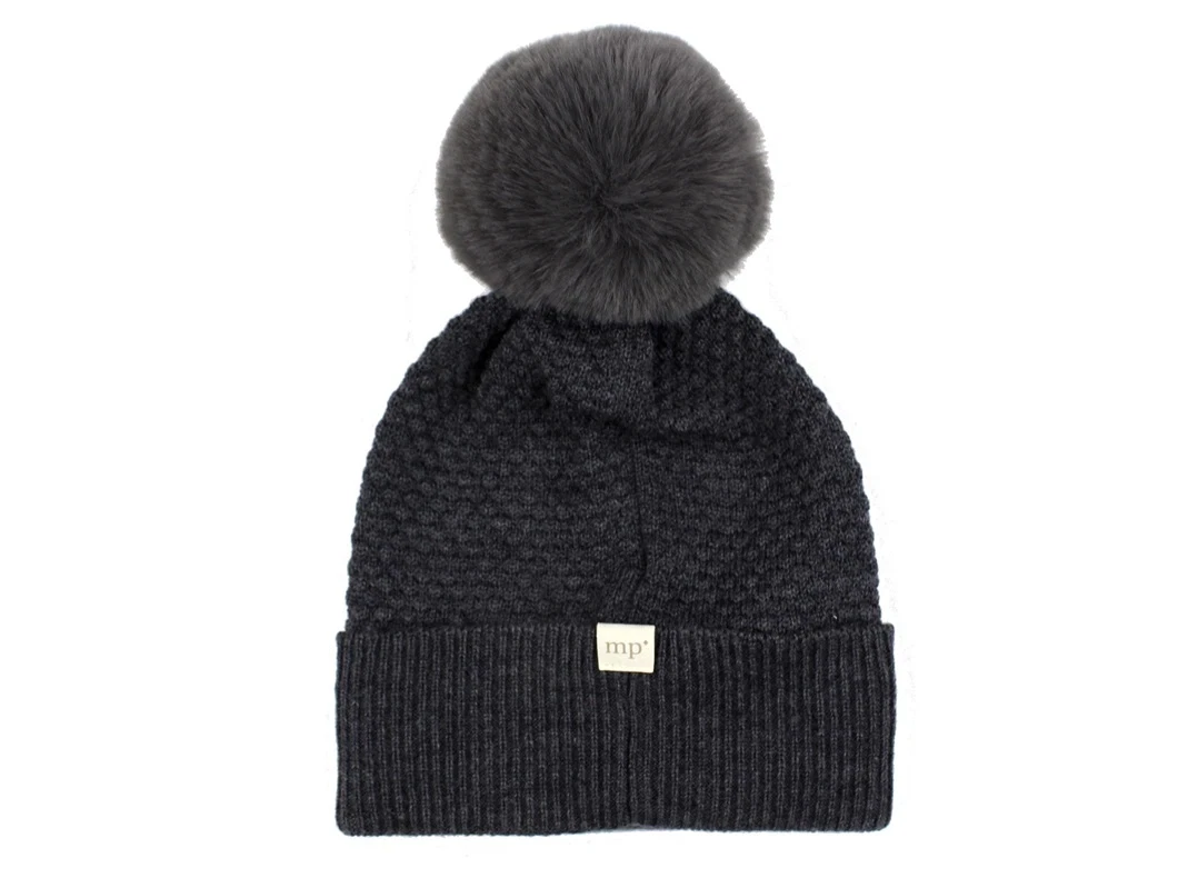 Hue i farven dark grey melange med 'faux fur'-kvast fra MP.