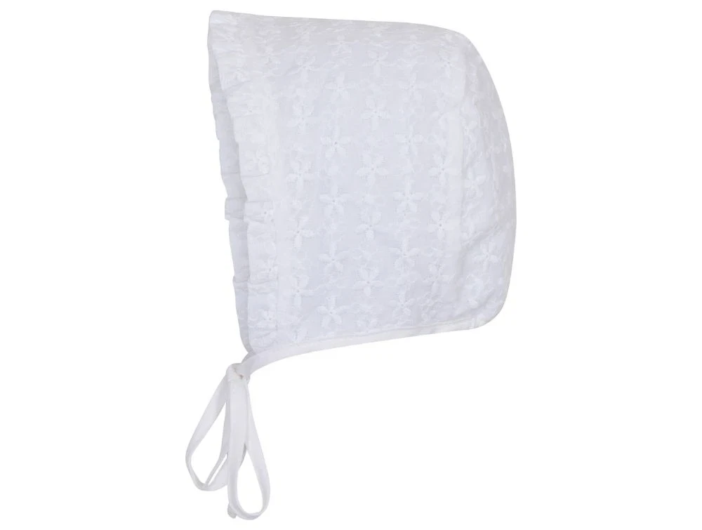 Hvid solhat fra MP i let bomuld med broderie anglaise og fine blomsterdetaljer. Modellen har rund hovedform og bindebånd under hagen, så den bliver siddende sikkert.