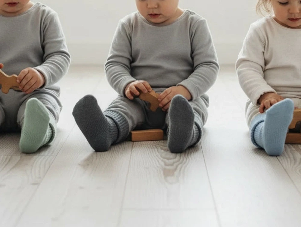 Den lange, foldede kant tilføjer en fin detalje og hjælper med at holde sokkerne godt på plads. Perfekte til små fødder, både til hverdag og særlige anledninger.