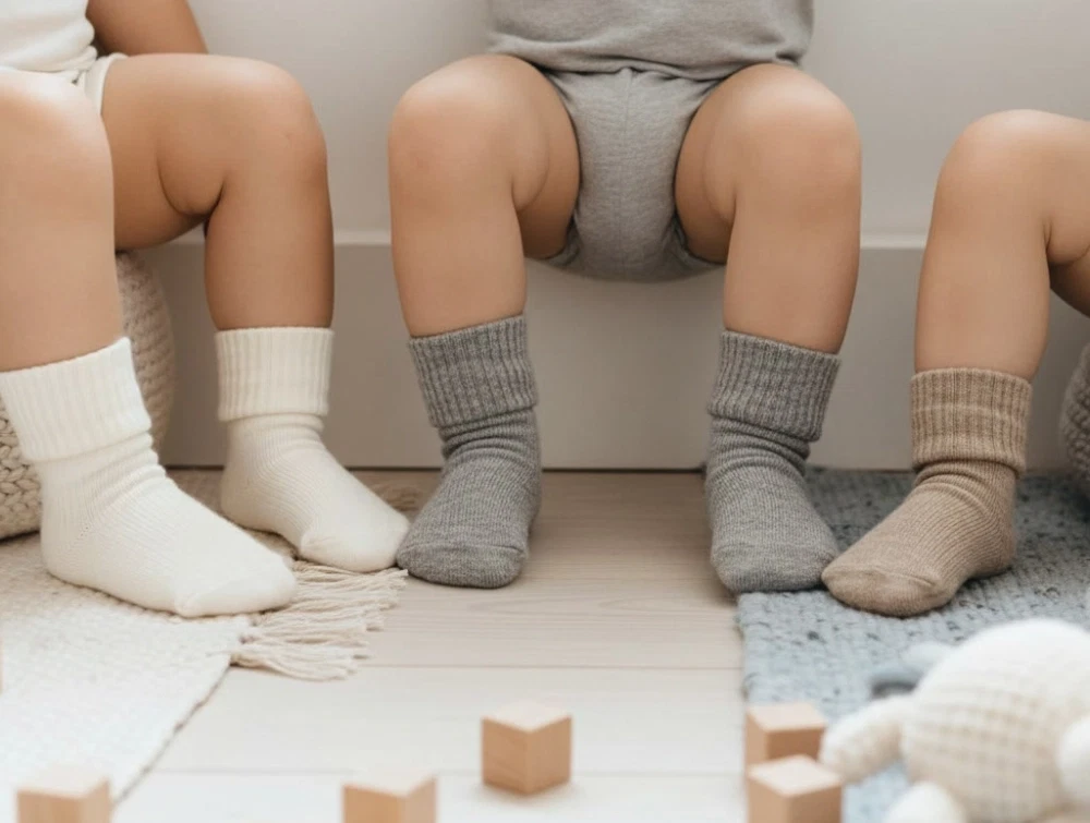 Den lange, foldede kant giver en sød detalje og hjælper med at holde sokkerne godt på plads. Perfekte til små fødder, både til hverdag og særlige anledninger.