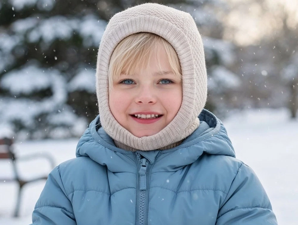 Designet har ribstrik omkring ansigt og hals, som giver en tæt og fleksibel pasform, så huen bliver siddende, når barnet bevæger sig. Merinoulden regulerer naturligt temperaturen og leder fugt væk fra huden, så barnet holdes varmt uden at blive klamt. Den fine struktur gør huen velegnet under cykelhjelm eller flyverdragt.