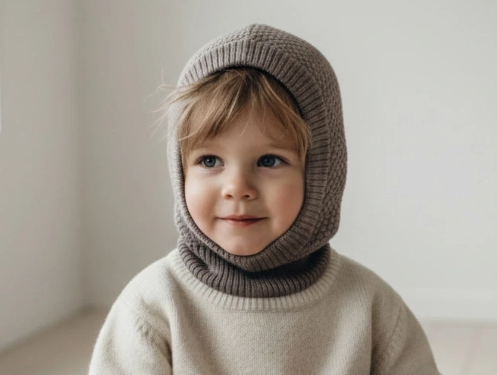Designet har ribstrik omkring ansigt og hals, som giver en tæt og fleksibel pasform, så huen bliver siddende, når barnet bevæger sig. Merinoulden regulerer naturligt temperaturen og leder fugt væk fra huden, så barnet holdes varmt uden at blive klamt. Den fine struktur gør huen velegnet under cykelhjelm eller flyverdragt.