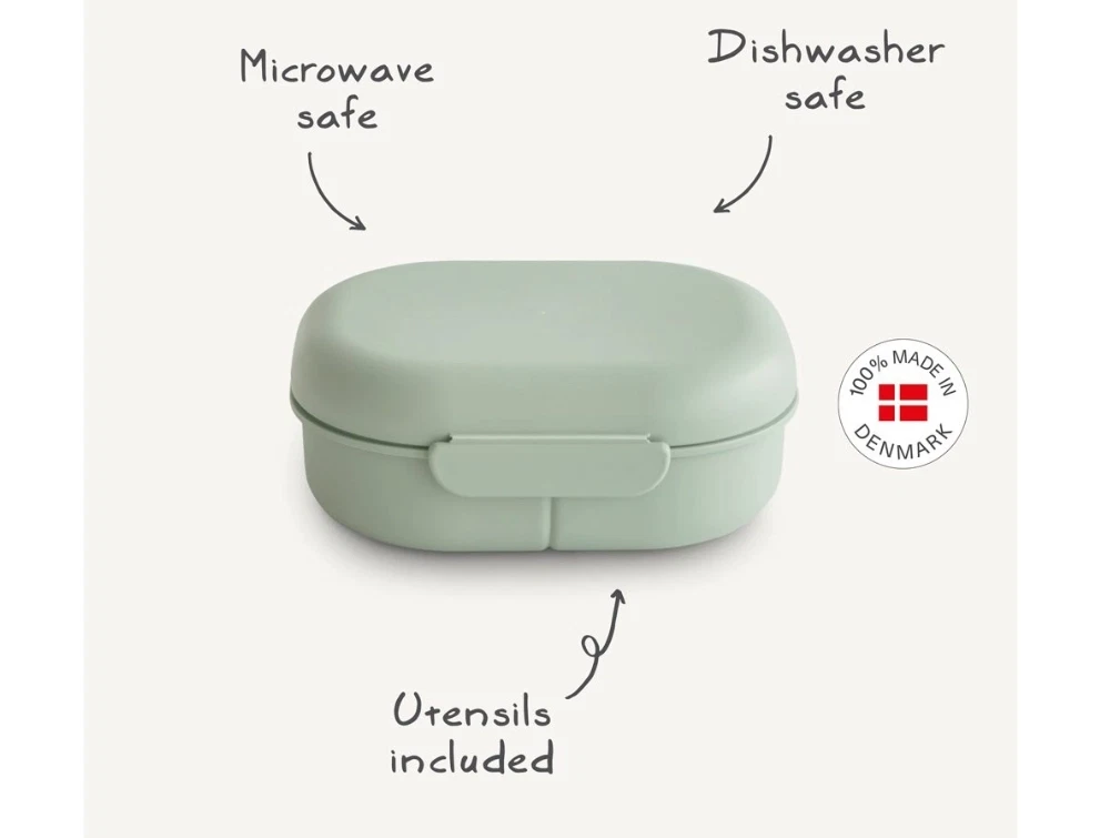 Mushie madkasse cloud åben med ske og gaffelMushie madkasse cloud fyldt med snacks i ruminddelingBørn bruger Mushie madkasse cloud ved spisebordetMushie madkasse cloud med ruminddeling og bestik- infobillede af madkassen i sage grøn