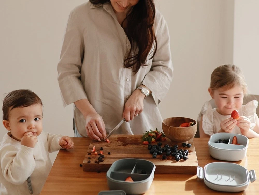 Madkasse i farven cloud fra Mushie med ruminddeling og integreret bestik. Perfekt til snacks og måltider på farten.