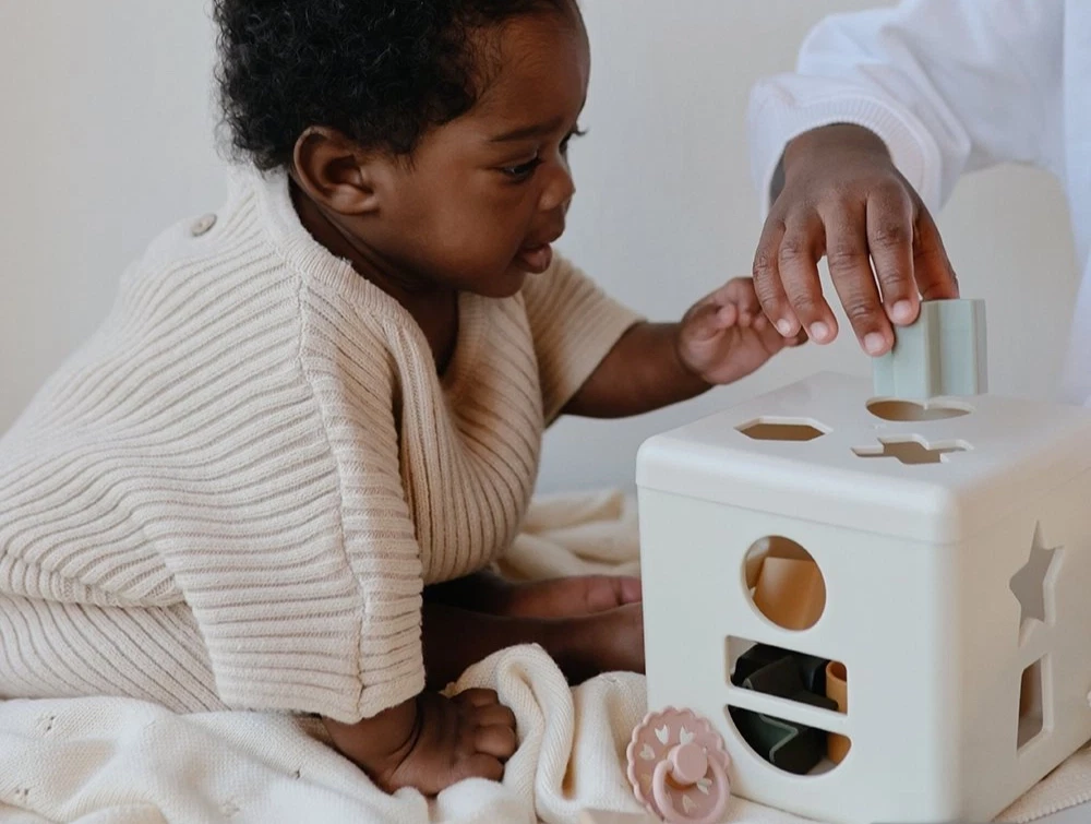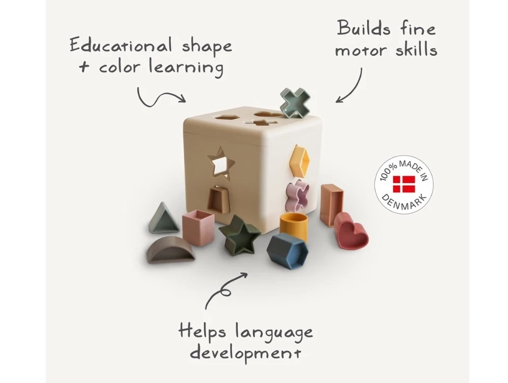 Mushie shape sorting box i beige med farvede figurerMushie shape sorting box med 12 farvede klodser og formerMushie shape sorting box med 12 farvede klodser og formerMushie aktivitetslegetøj