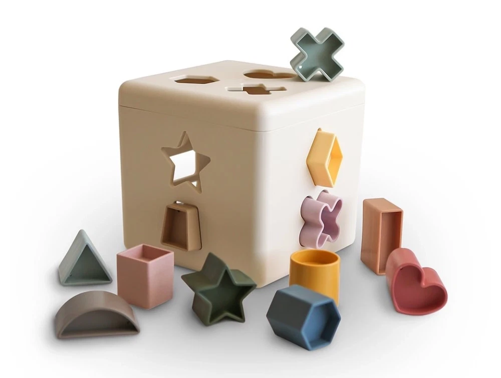 Formsorteringsboks i beige med farverige figurer fra Mushie. Legetøjet styrker finmotorikken og hjælper barnet med at lære former og farver.