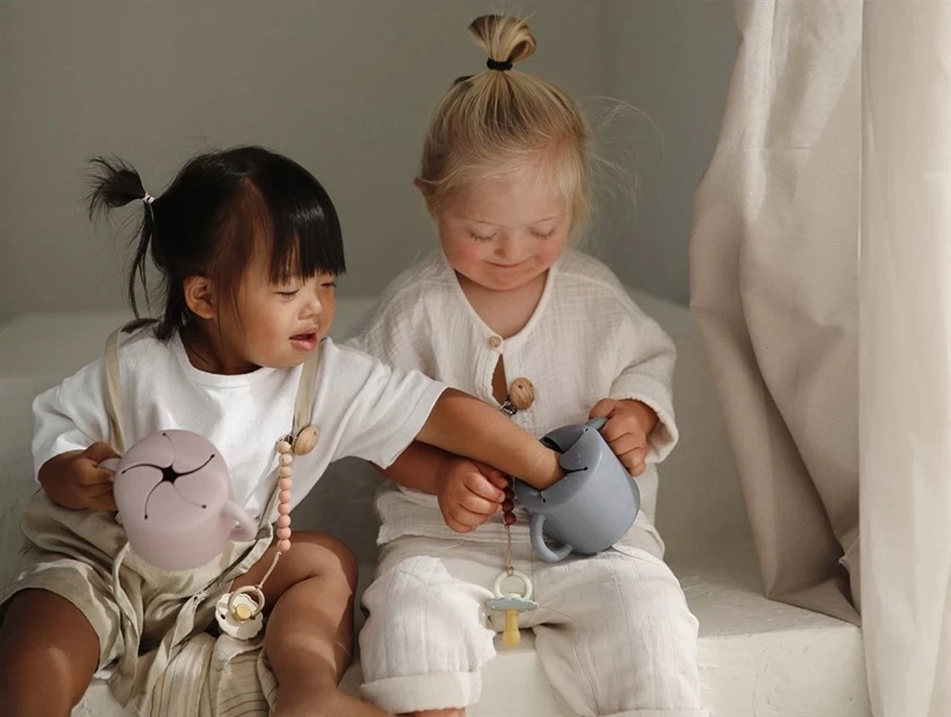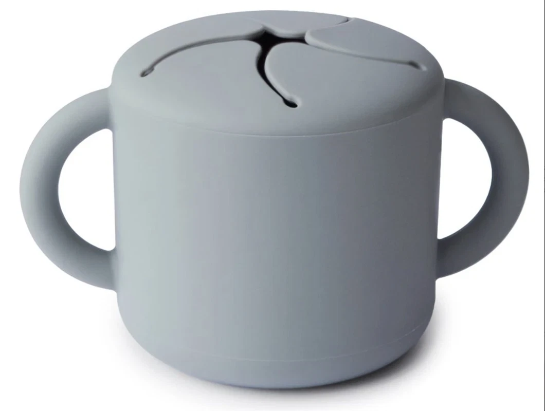 Super praktisk snack kop i blød silikone til de yngste i farven stone fra Mushie.