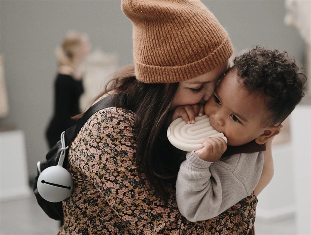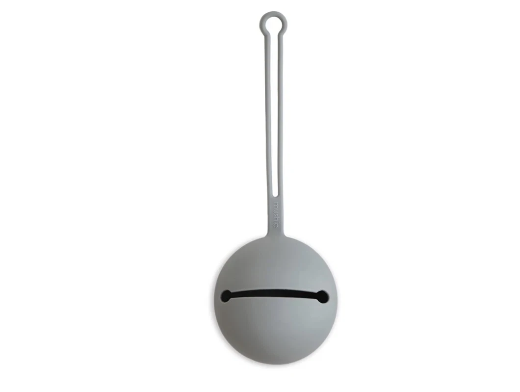 Sutteopbevaring i silikone i farven stone fra Mushie.