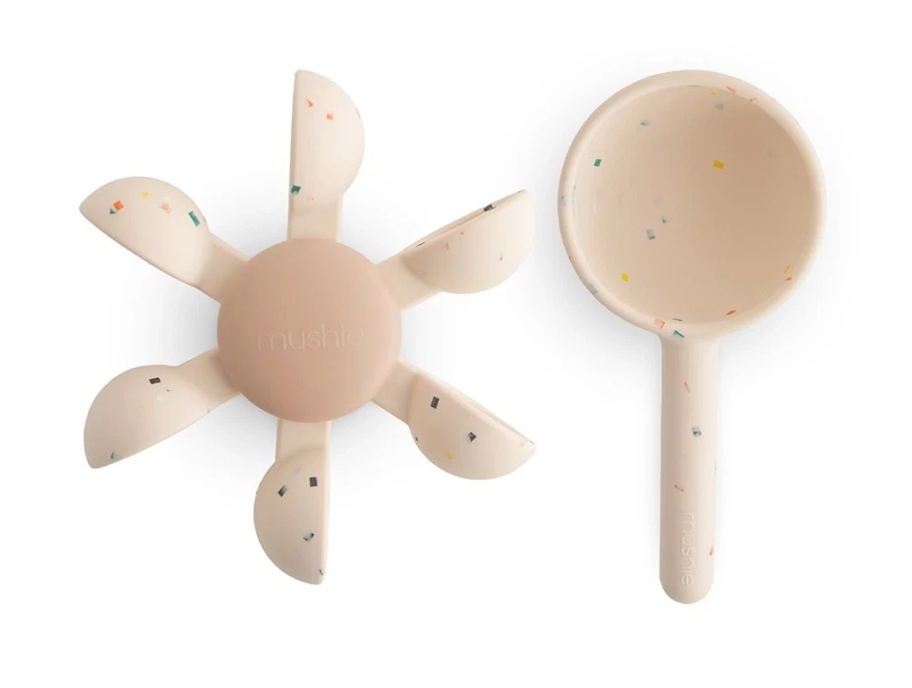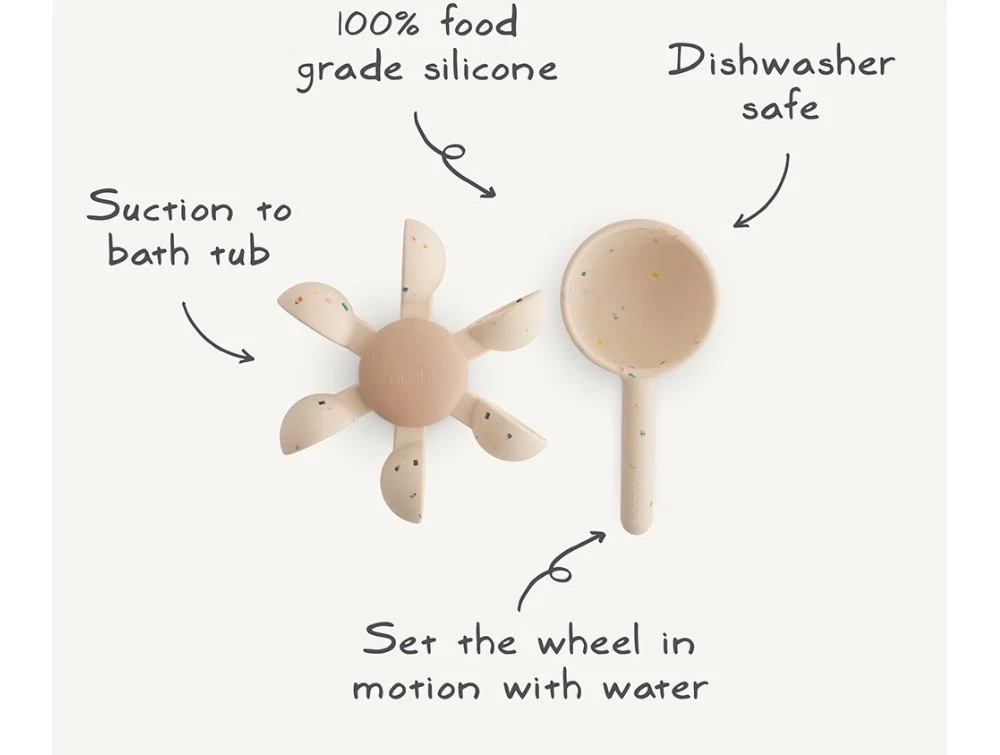 Vandhjul badlegetøj i lys creme nuance med confetti fra Mushie. Legetøjet består af et vandhjul med sugekop og en skål, der sætter hjulet i gang med vand.
