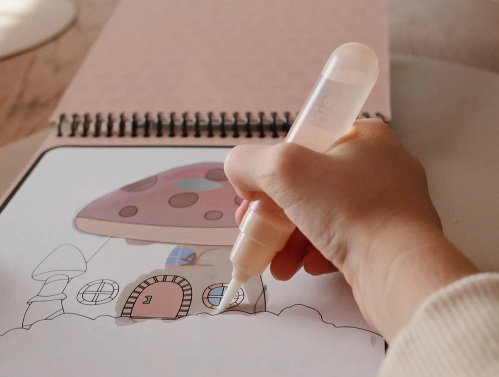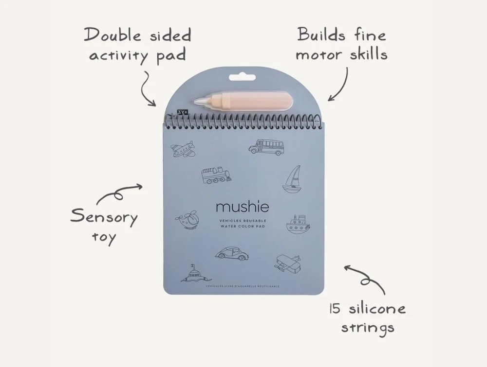 Genanvendelig vandmalebog i eventyrligt fe-tema fra Mushie. Med den medfølgende vandpensel kan barnet male med vand og se farver og små detaljer dukke frem – helt uden maling og rod.