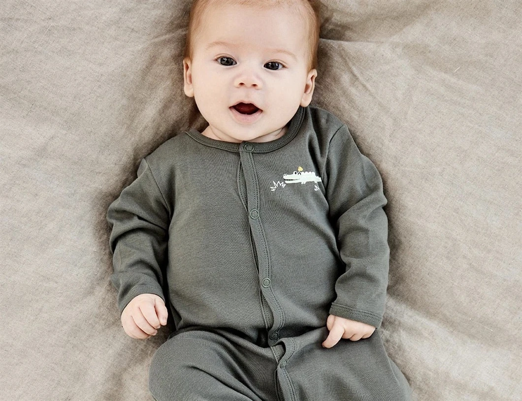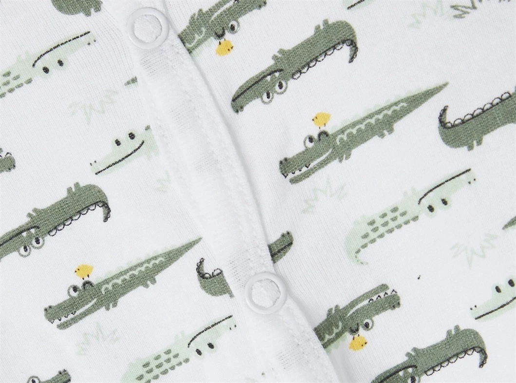 Den ene dragt er ensfarvet grøn med print af krokodille og den anden er hvid har all-over-print af krokodiller.