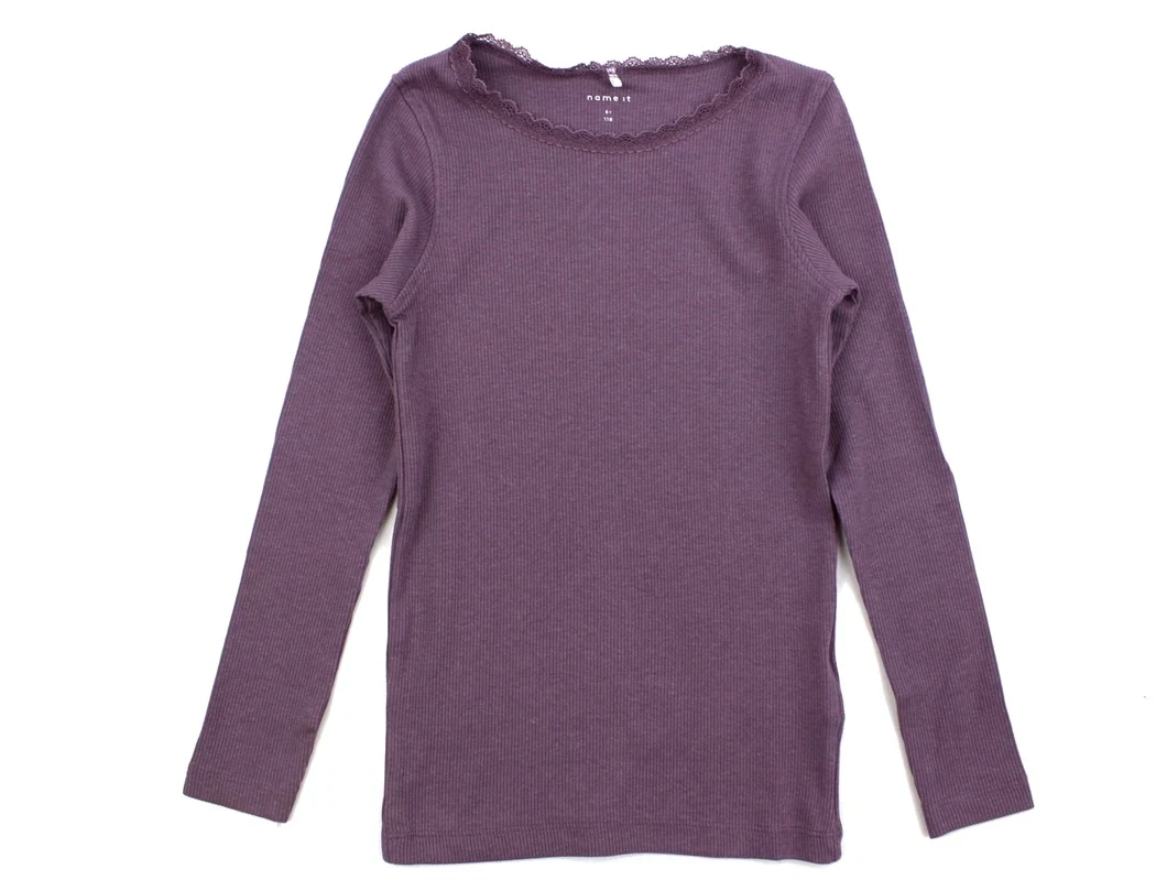 Langærmet top i farven arctic dusk med blonde ved halsåbning fra Name It.