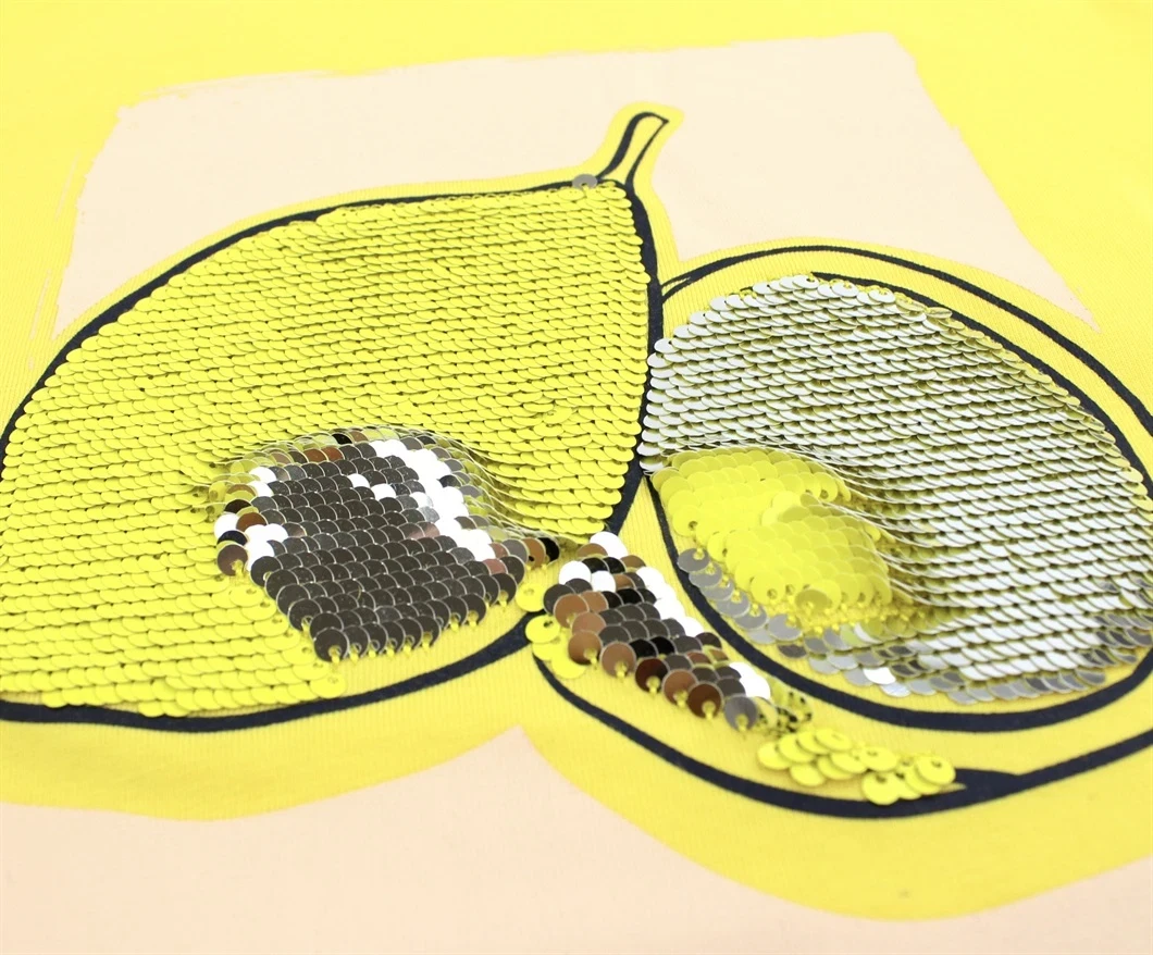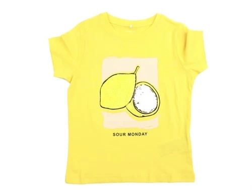 T-shirt i farven aspen gold med citron-print og tofarvede palietter fra Name It.