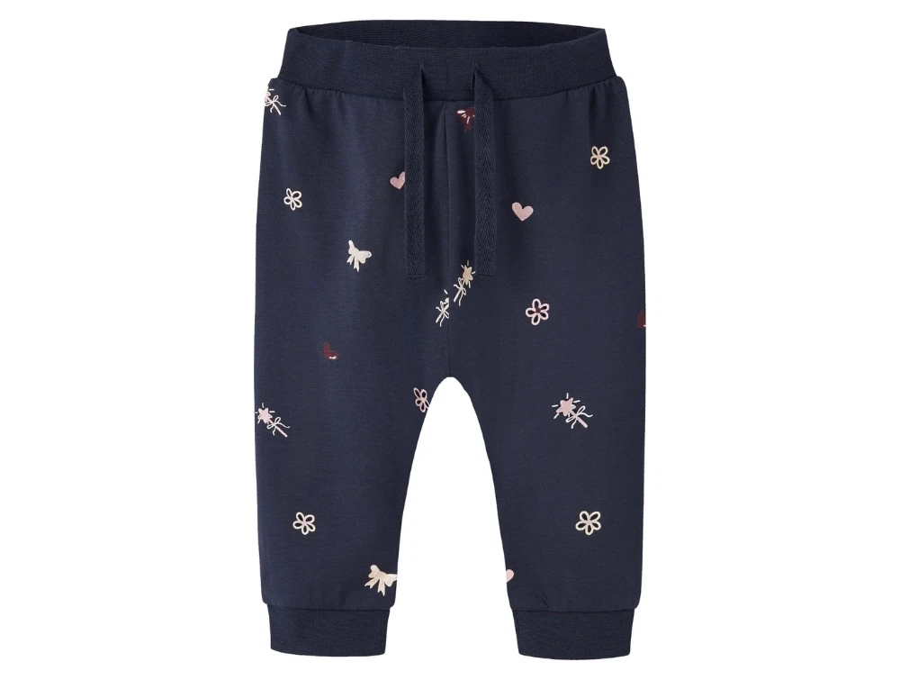 Bukser i mørkeblå nuance (navy blazer) fra Name It. De fine blomster- og hjerteprint giver et sødt udtryk, mens den bløde jerseykvalitet sikrer god komfort for barnet.