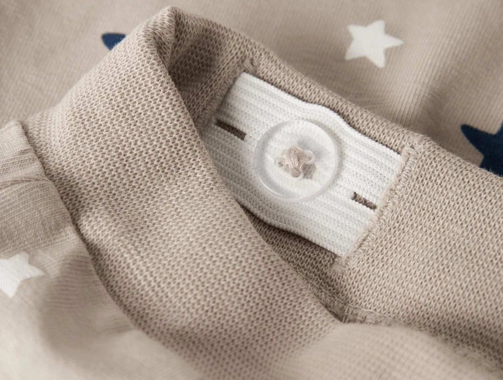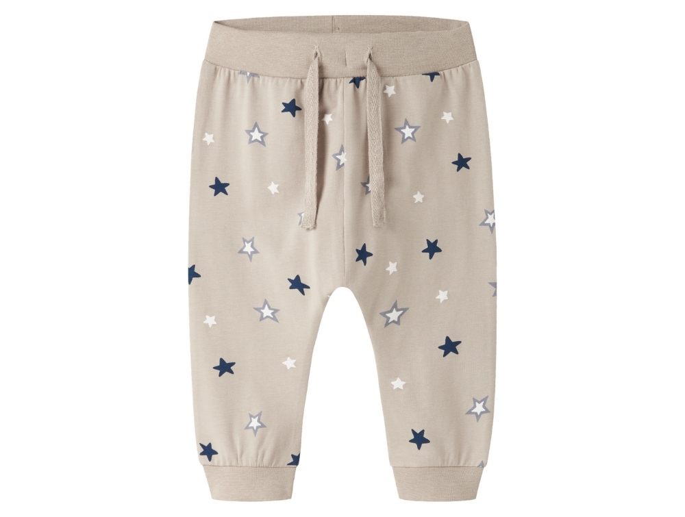 Bukser i lys sandfarvet nuance (island fossil) fra Name It. De har et fint print med små stjerner og er fremstillet i blød jerseykvalitet, som føles behagelig mod huden.