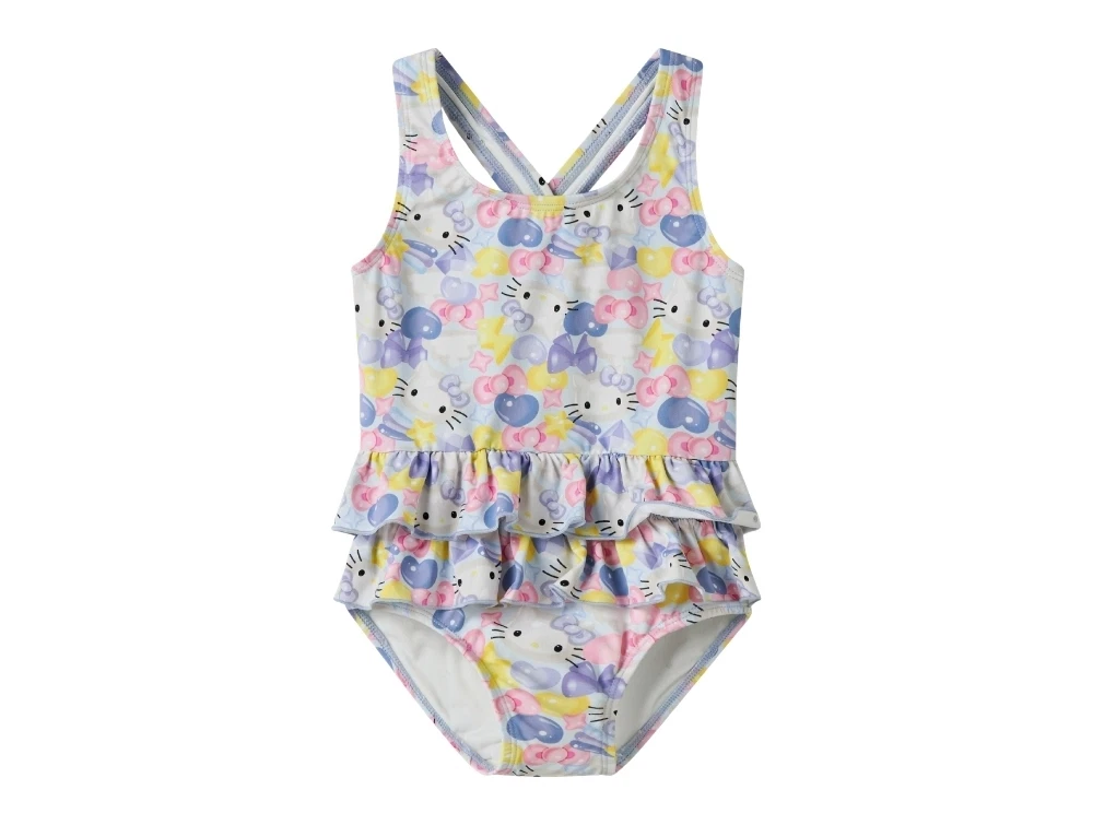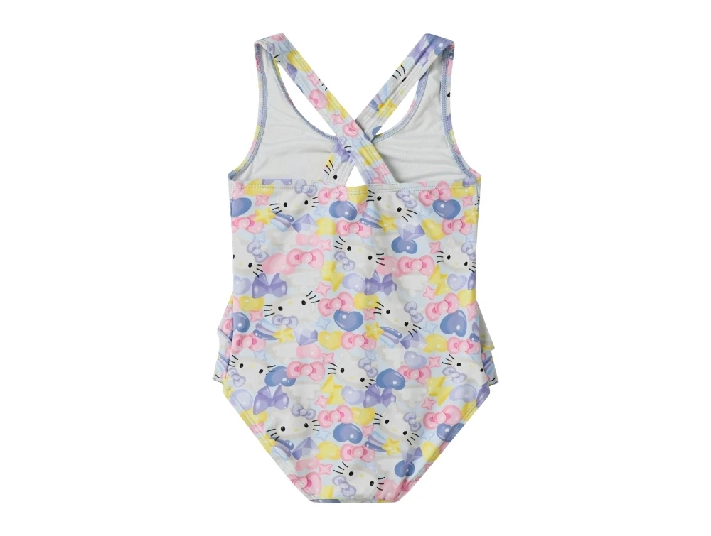Hello Kitty er en klassisk figur fra Sanrio-universet og er kendt for sit søde udtryk og ikoniske sløjfe. Printet kombinerer figuren med farverige sløjfer, stjerner og hjerter, som giver badedragten et livligt udtryk.