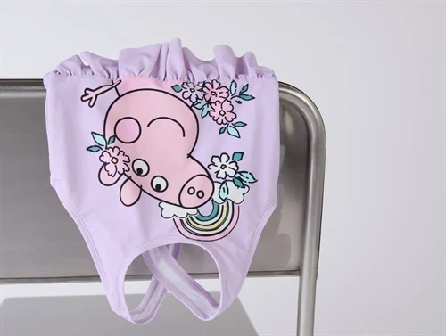 Badedragt i lilla (orchid bloom) fra Name It med sødt Gurli Gris-print og flæsedetaljer.