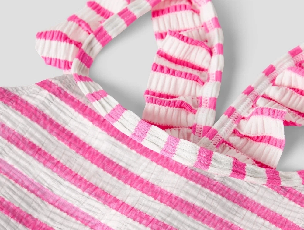 Den ribbede struktur og de fine flæsedetaljer på stropperne giver et legende og sommerligt udtryk.
