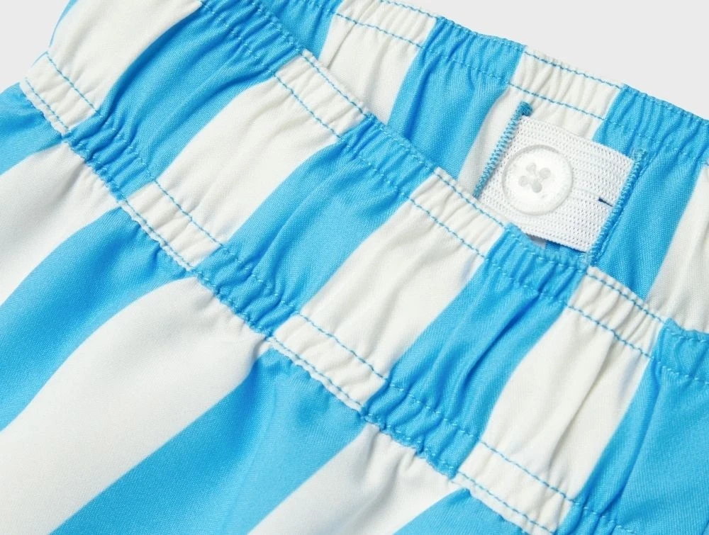 Sommerlige badeshorts med striber i blå og hvid med klassisk snøre i taljen. Modellen har elastisk talje med justerbar bindesnøre og er fremstillet i let vævet kvalitet med let struktur. Lavet i 100% genanvendt polyester – ideel til strandture og vandleg i sommervarmen.