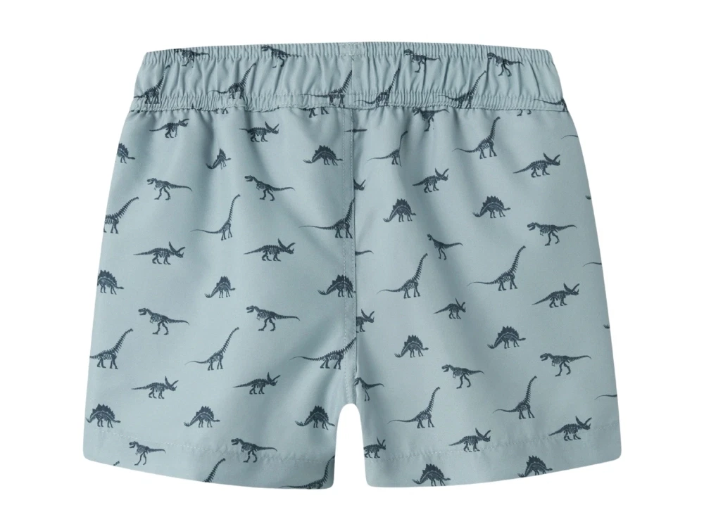 Badeshorts i blå nuance (Blue Fog) fra Name It med allover print af små dinosaurer.