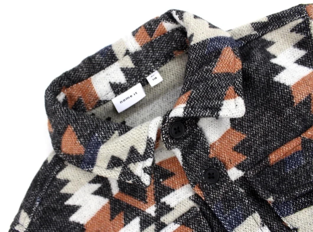 Den har en skjortekrave, lange ærmer med knappede manchetter, to brystlommer med knaplukning og lukkes med knapper foran. Det gentagne mønster på stoffet tilføjer et trendy touch til designet.