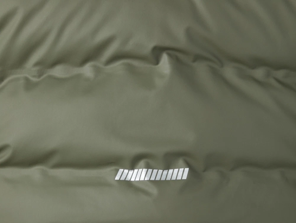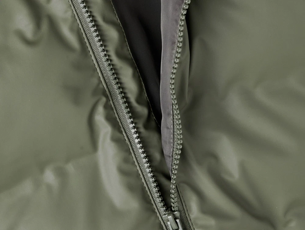 Jakken er fremstillet af polyurethan, et yderst holdbart stof med en subtil glans, der giver et stilfuldt udseende. Den er udstyret med en hætte, lange ærmer med ribstrikkede manchetter og lynlåslukning for ekstra komfort og beskyttelse.