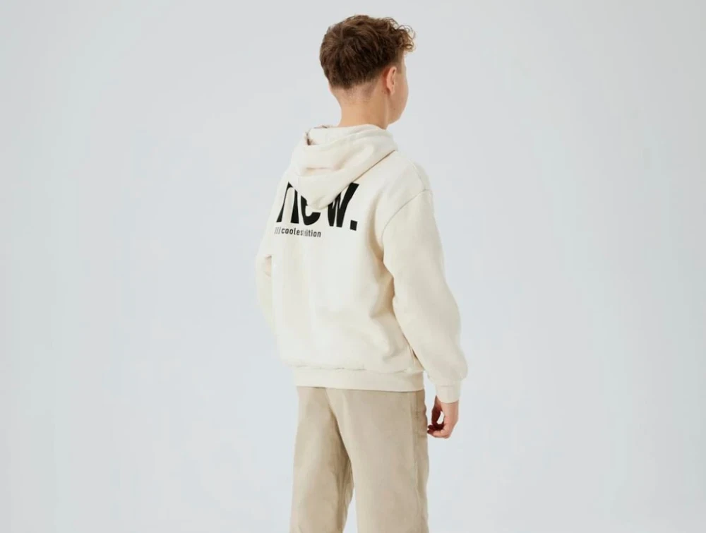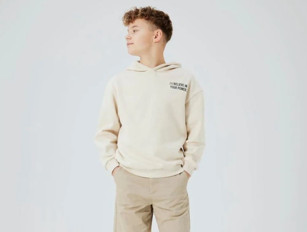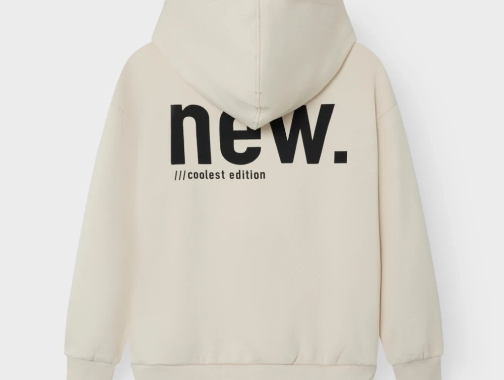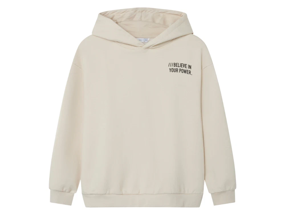 Hoodie i farven birch med cool tekst-print på front og ryg fra Name It.