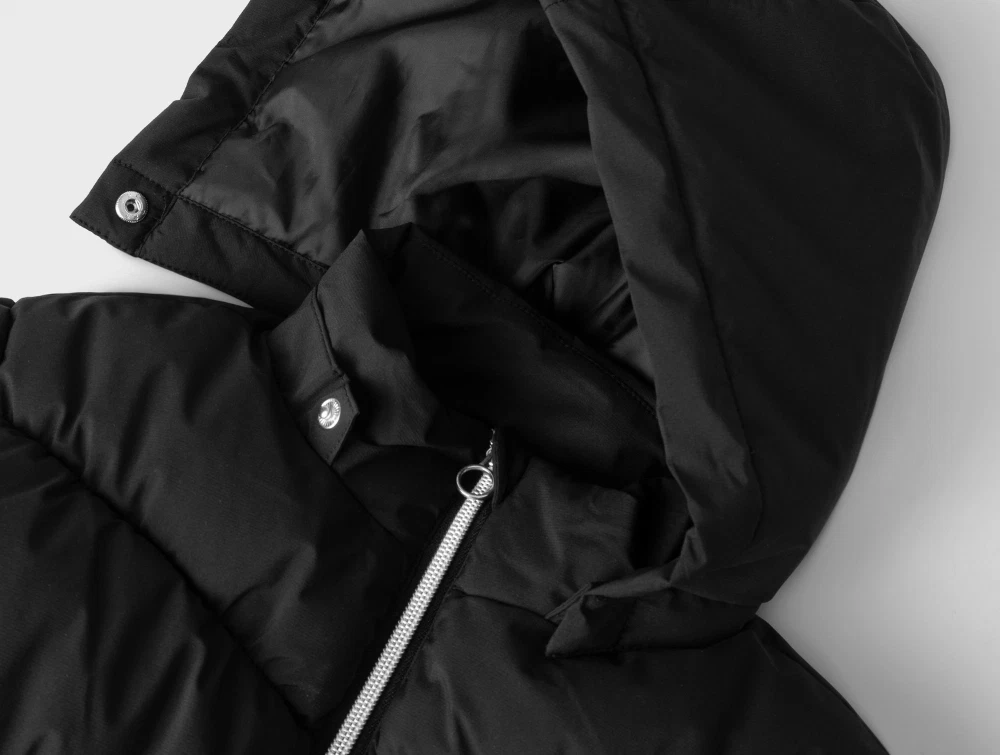 Jakken har aftagelig hætte med trykknapper, to skrålommer og lukkes med sølvfarvet lynlås.