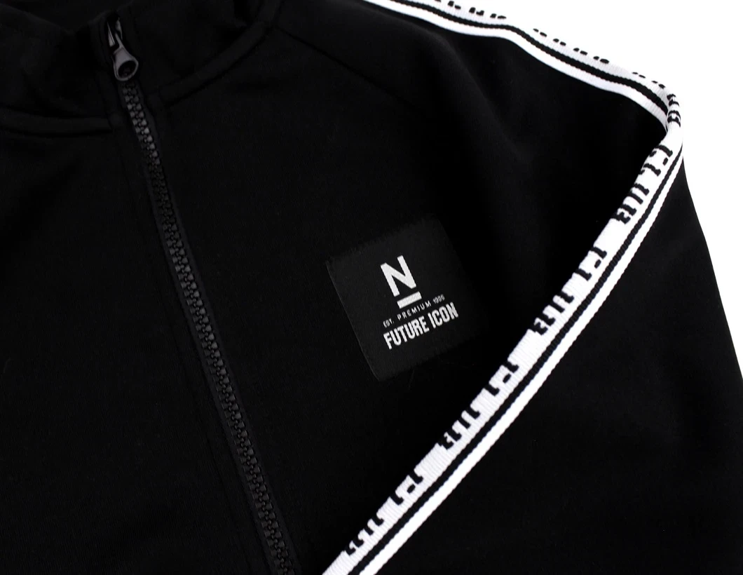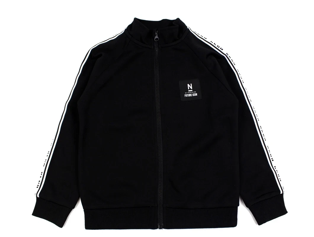Cool sporty sweatcardigan i farven sort med lynlås og hvidt kantbånd fra Name It.