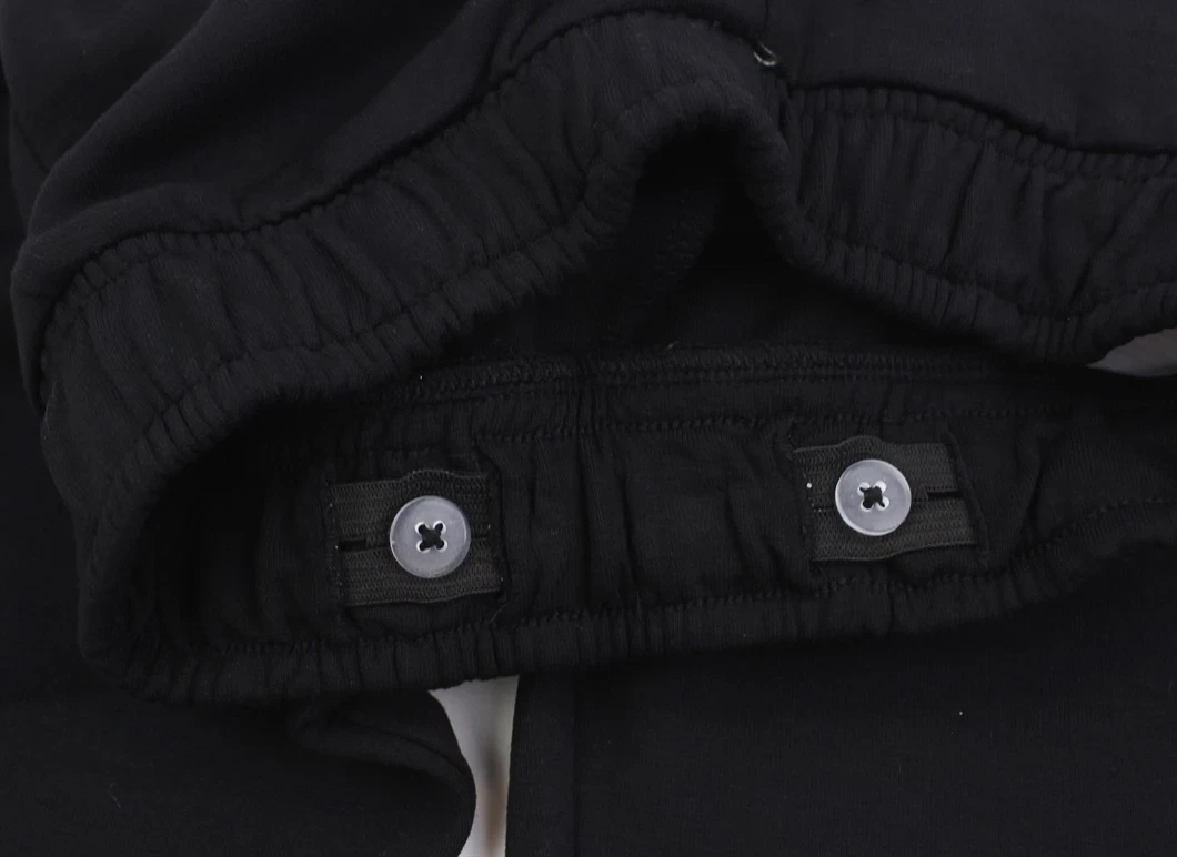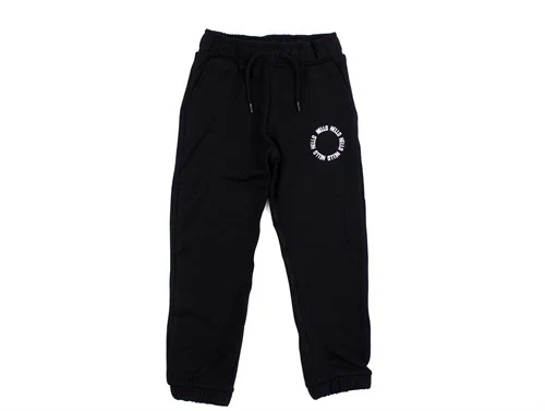 Sorte sweatpants med sølvfarvet "hello" tekst i ring.