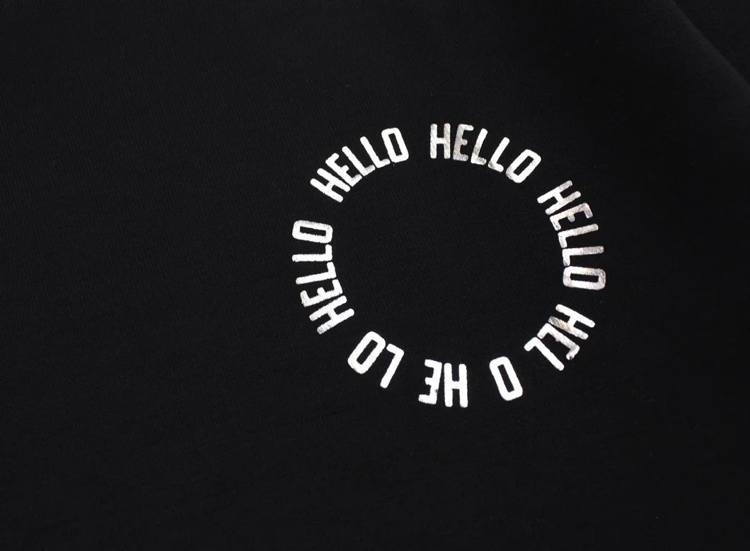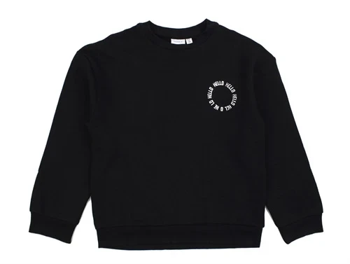 Sort sweatshirt fra Name It med sølvfarvet "hello" tekst i ring.