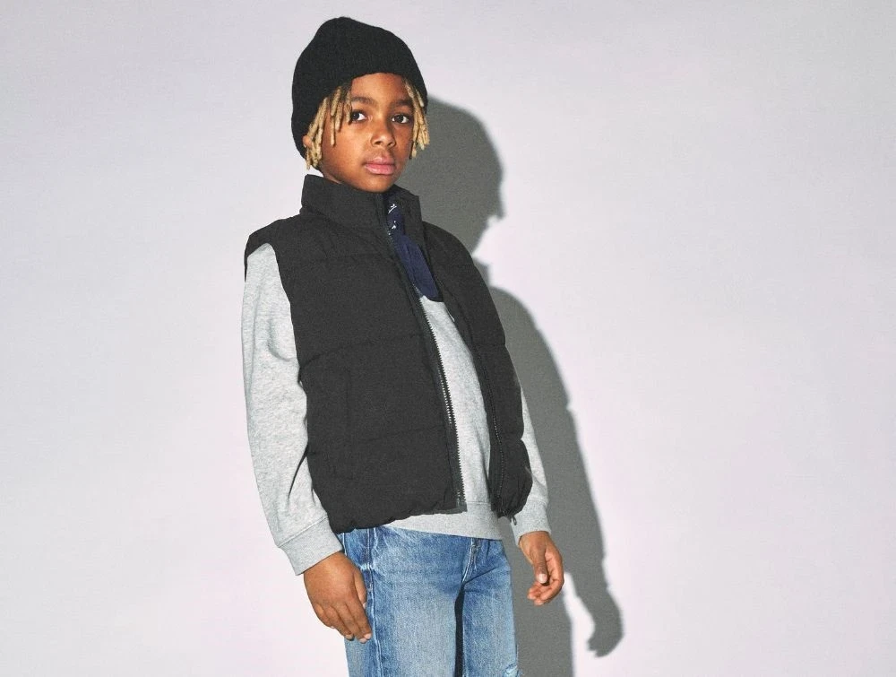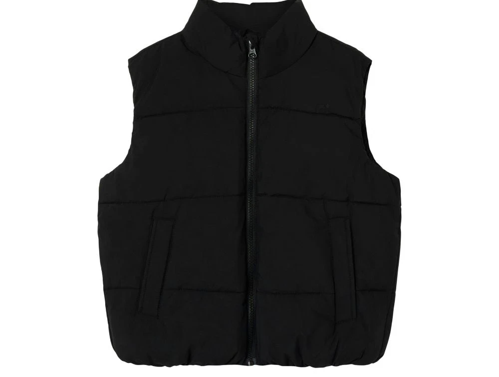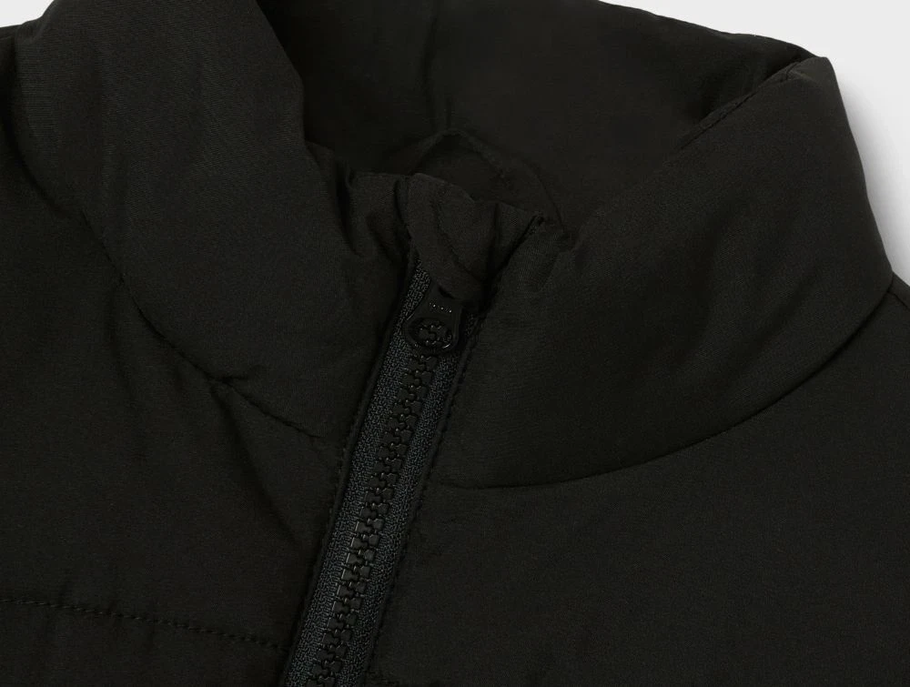Vesten lukkes med lynlås, har to sidelommer og en let polstring, der er velegnet til de mellemliggende sæsoner.