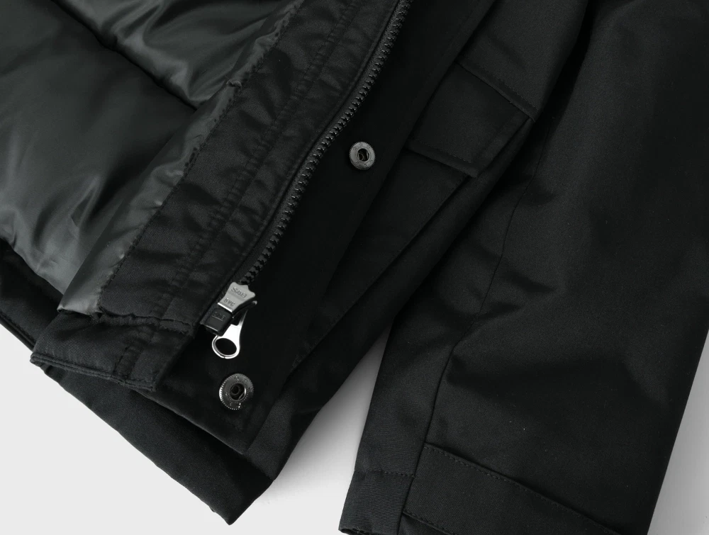 Jakken har aftagelig hætte og fire lommer med trykknapper.