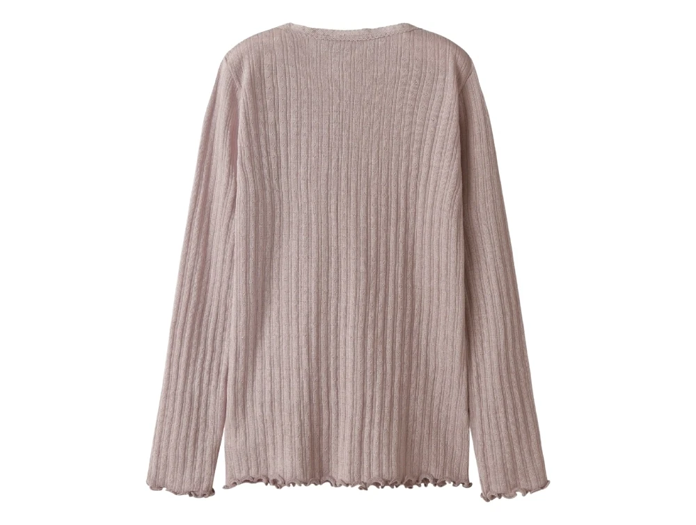 Ribstrikket design med blondekant i halsen og bølgekant ved afslutninger giver et feminint præg.