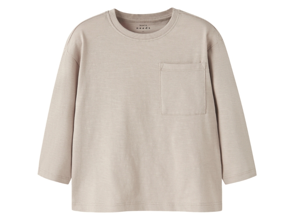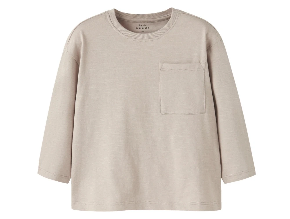 Bluse i beige nuance (island fossil) fra Name It. Den har en afslappet pasform og en praktisk brystlomme foran.