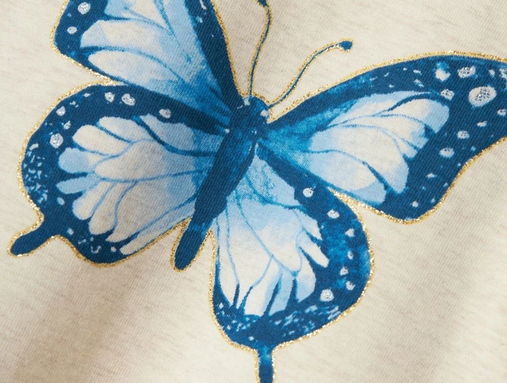Blød og strækbar t-shirt med lange ærmer i en meleret beige nuance. Toppen har et flot print af en sommerfugl i blå nuancer med guldglitterdetaljer.