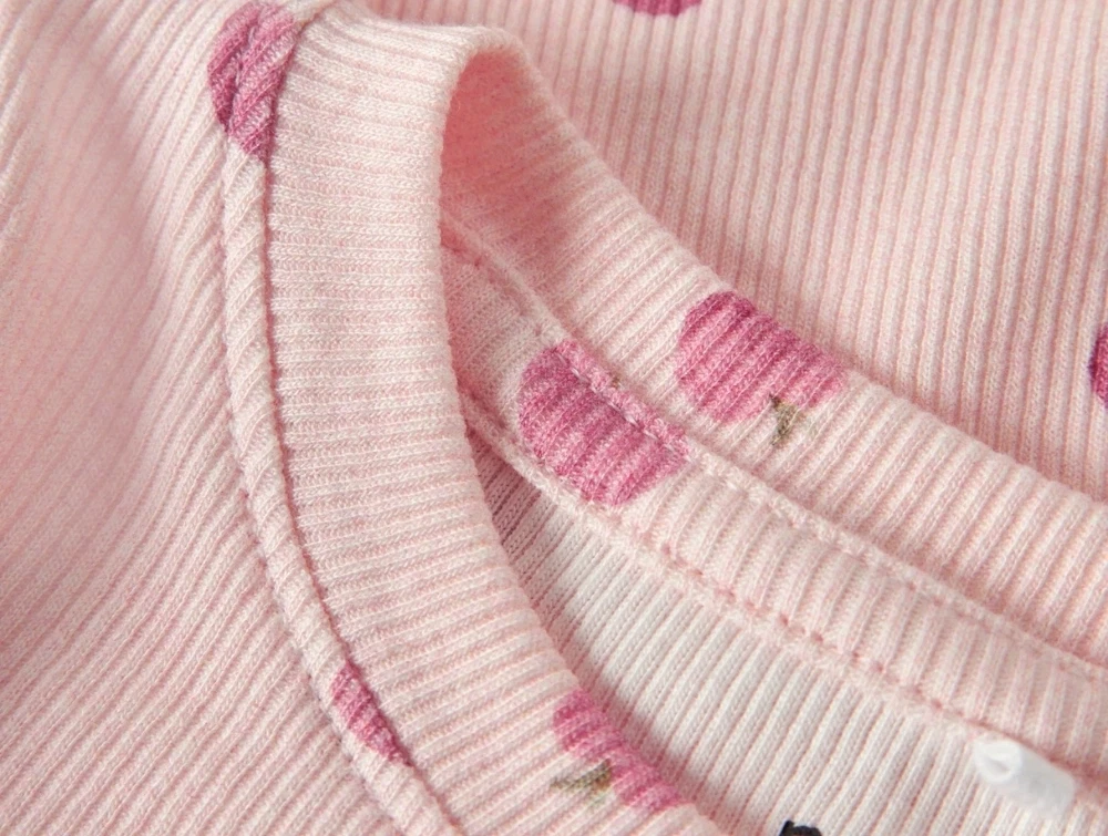 Designet har rund hals, lange ærmer og almindelig pasform. Det allover æbleprint giver et sødt udtryk, mens ribstrukturen tilfører et klassisk look.