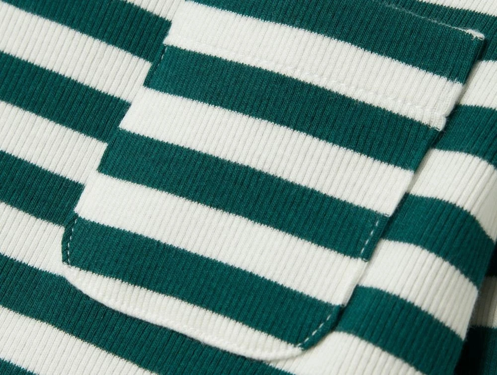 Blød og strækbar ribstrikket bluse fra Name It med smalle striber i grøn og råhvid. Modellen har lange ærmer, rund hals og en lille brystlomme som fin detalje. Den tætsiddende pasform og det elastiske materiale gør blusen både behagelig og praktisk til hverdagsbrug.