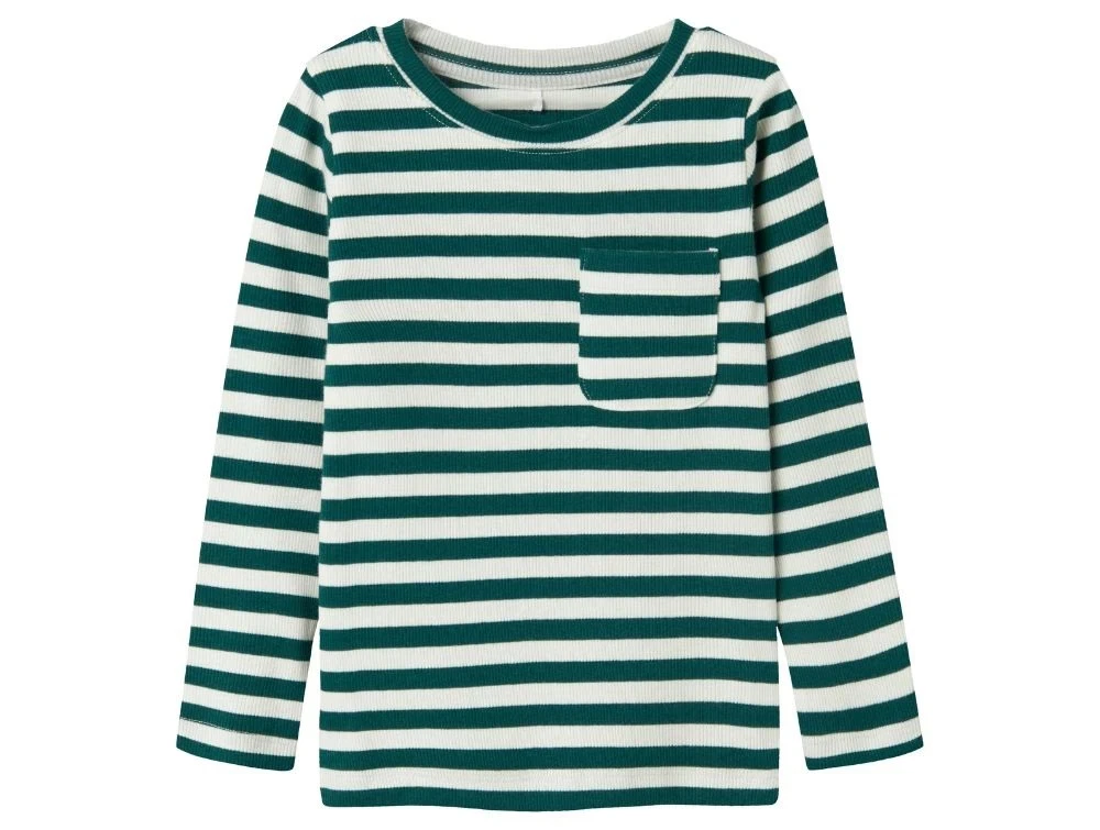 Name It bluse forest biome/cloud dancer med striberGrøn og hvis stribet bluse med lange ærme og lille lomme fra Name It