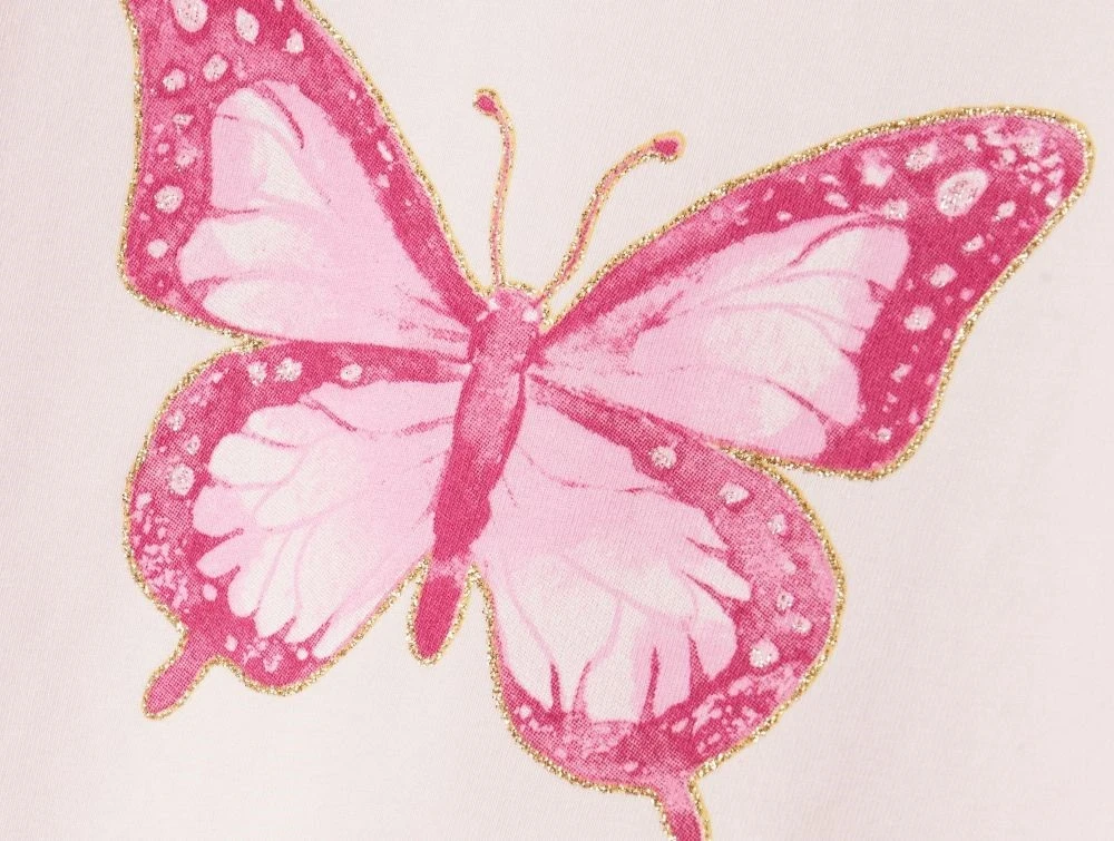 Blød og strækbar t-shirt med lange ærmer i en lyserød nuance. Toppen har et flot print af en sommerfugl i pink nuancer med guldglitterdetaljer.