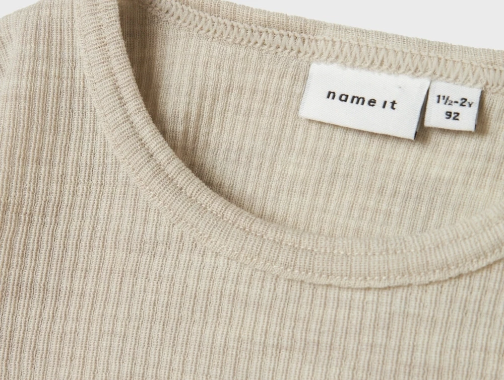 Name It t-shirt i nacreous cloud merinould rib på barnName It t-shirt i nacreous cloud merinould rib set forfraName It t-shirt i nacreous cloud merinould rib detalje af halsName It t-shirt i nacreous cloud merinould rib set bagfra