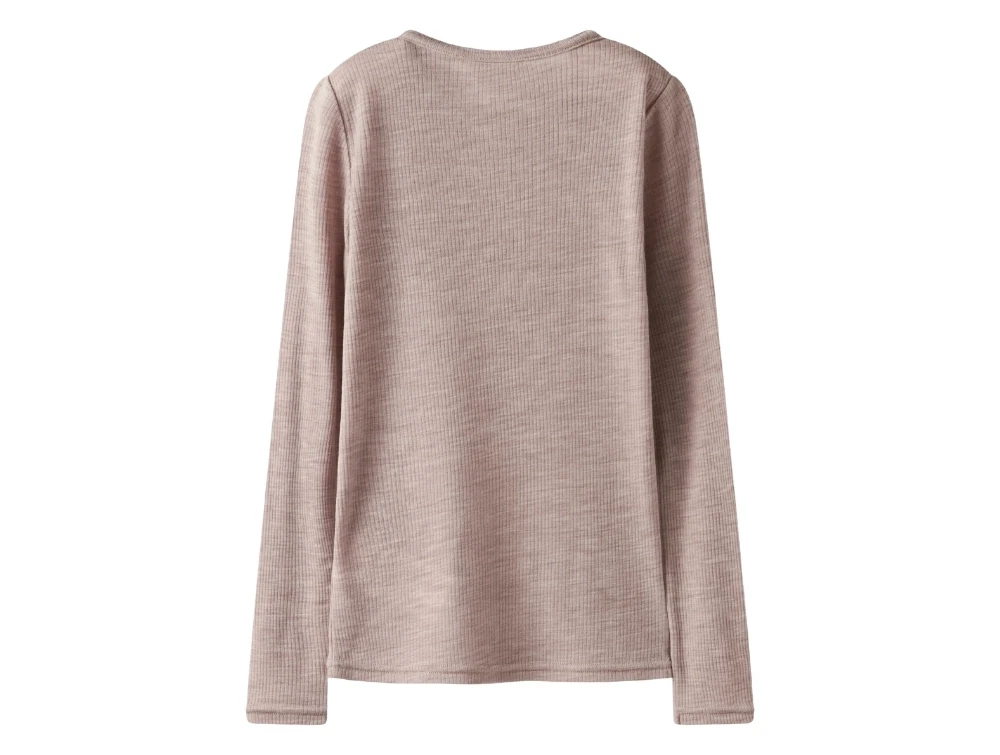 Bluse i støvet rosa nuance (shadow gray) fra Name It i blød merinould med lange ærmer og et fint rib mønster.