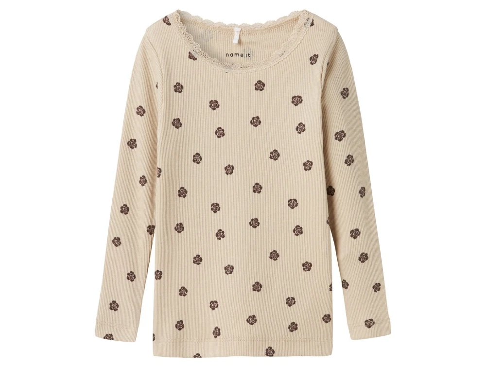 Ribbluse i beige nuance fra Name It med små blomsterprint over hele overfladen. Blusen har en fin blondekant i halsen og en lille sløjfe foran, som giver et feminint udtryk.