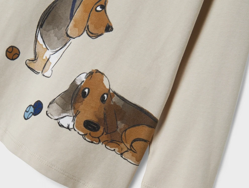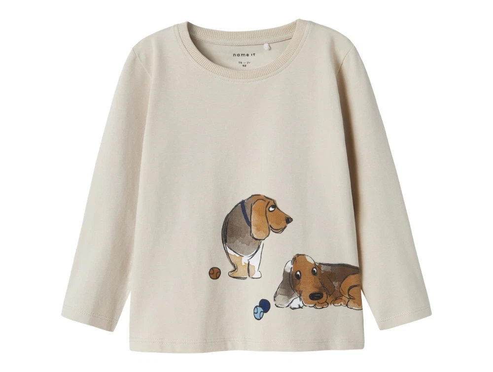 Bluse i beige nuance fra Name It med et sødt hundeprint på fronten. Motivet viser to basset hounds med bolde og giver et legende og hyggeligt udtryk.
